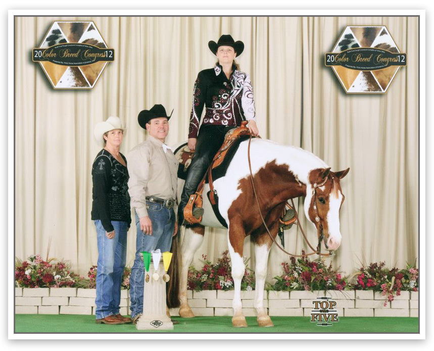 ![]() MADE PRETTY COLOR BREED CONGRESS TOP TENS Jr Western Pleasure, Cash Challenge Western Pleasure All Ages, Green Western Pleasure, and Cash Challenge 3 and 4 Year Old Western Pleasure ![]() LOPIN TO POTENTIAL Back To Berrien Top Five ![]() INVEST IN A KISS Color Breed Congress 3 Time Reserve Champion, multiple Pinto World Show Top Fives and show All Around Champion |